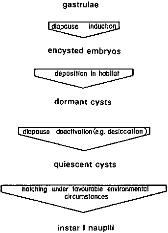 As Artemia is an inhabitant of biotopes characterized by unstable environmental conditions, its survival during periods of extreme conditions (i.e. desiccation, extreme temperatures, high salinities) is ensured by the production of dormant embryos. Artemia females can indeed easily switch from live nauplii production (ovoviviparity) to cyst formation (oviparity) as a fast response to fluctuating circumstances. Although the basic mechanisms involved in this switch are not yet fully understood, but sudden fluctuations seem to trigger oviparity (oxygen stress, salinity changes...). The triggering mechanism for the induction of the state of diapause is however not yet known. In principle, Artemia embryos released as cysts in the medium are in diapause and will not resume their development, even under favourable conditions, until they undergo some diapause deactivating environmental process; at this stage, the metabolic standstill is regulated by internal mechanisms and it can not be distinguished from a non-living embryo. Upon the interruption of diapause, cysts enter the stage of quiescence, meaning that metabolic activity can be resumed at the moment they are brought in favorable hatching conditions, eventually resulting in hatching: in this phase the metabolic arrest is uniquely dependent of external factors (Fig. 4.2.4.). As a result, synchronous hatching occurs, resulting in a fast start and consequent development of the population shortly after the re-establishment of favorable environmental conditions. This allows effective colonization in temporal biotopes.