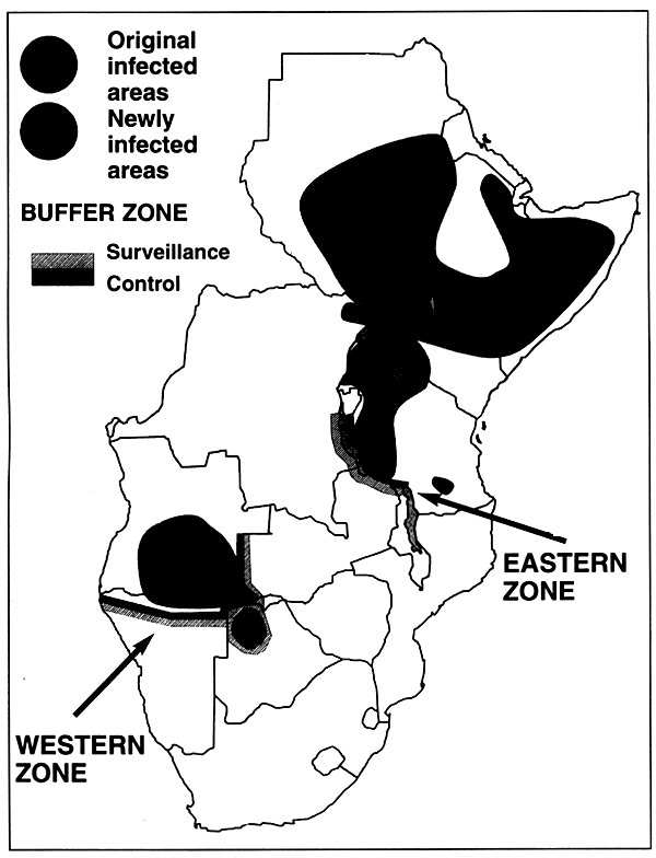 Civil disturbances in Ethiopia and Sudan have subsequently reduced the effectiveness of these control measures (particularly control of the movement of livestock) and in the last decade the disease has spread back into Uganda, Rwanda, Kenya and Tanzania. During the last 12 months (1994–95) infected animals have moved along trade routes into southern Tanzania and outbreaks of disease have occurred there which threaten Zambia, Zimbabwe, Malawi and Mozambique. On the other hand civil disturbances in Angola have led to the migration of infected cattle from that country into Namibia, and very recently, across the Caprivi strip into Botswana.