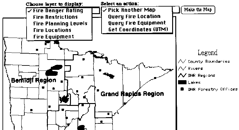 Les lecteurs qui ont accès au Web peuvent consulter les applications décrites ci-dessous en se connectant à http://www.gis.umn.edu/fornet/ir/fire qui présente le Système d'information complet sur les feux de forêt du Minnesota.