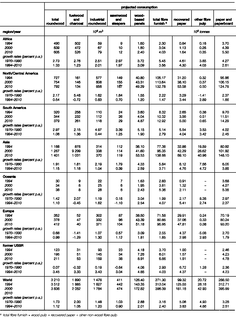 Since the release of the 1991 projections, FAO has successively reduced its estimates of global consumption except for 'other fibre pulp' (which has risen in the latest projections) on the basis of lowered assumed rates of economic growth that can be sustained for long periods.
