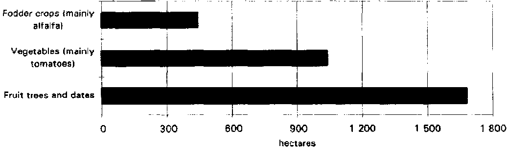 In the period from 1956 to 1977, agricultural lands decreased from about 6 460 ha (with 3 230 ha cultivated) to about 4 100 ha (with 1 750 ha cultivated). This decrease was attributed mainly to urban expansion, waterlogging and soil salinization due to deterioration of the quality of the groundwater used in irrigation. In an attempt to reverse the situation, the government initiated a major agricultural development program in the early 1980s represented by:
