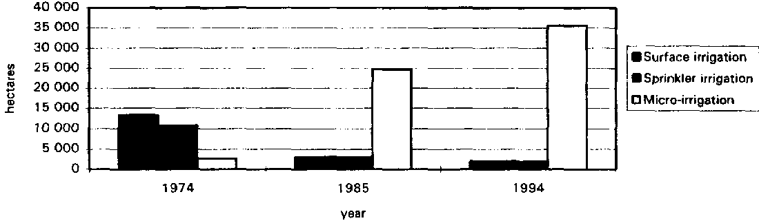 The irrigation network in Cyprus is highly efficient. It generally consists of closed systems with an overall conveyance efficiency averaging 90-95 %. Field application efficiency averages 80-90%. In parallel with the government's efforts to increase the water available for agriculture, emphasis was placed on the optimum utilization of water through improved irrigation methods. To encourage farmers to use improved irrigation methods the government offered incentives to participating farmers in the form of subsidies and long-term low interest loans for the purchase and installation of improved irrigation systems. In addition, through extensive demonstrations, the government convinced the farmers that improved irrigation methods, initially sprinklers for vegetables and the hose/basin method for tree crops, to be followed by micro-irrigation systems, not only saved water but also led to increased yields. As a result of these efforts, the area irrigated by surface irrigation methods has declined from about 13 400 ha in 1974 to less than 2 000 in 1995 while the area equipped for micro-irrigation has increased over the same period from about 2 700 ha to almost 35 600 ha (Figure 4). There are few margins for further improvements in water application efficiency. The areas irrigated by surface irrigation methods are mostly cropped with deciduous trees and are found in the hilly areas of the country. They are usually irrigated from small springs which do not lend themselves easily to the adoption of improved irrigation techniques.