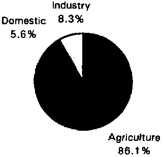 Table 4 shows the actual water availability and water use by the different sectors. Agricultural water withdrawal includes an annual estimated loss of 2 km³/year due to evaporation from 31 000 km of canals (1 000 km of main canals and 30 000 km of secondary canals). Figure 1 shows the distribution of water withdrawal by sector in 1993.