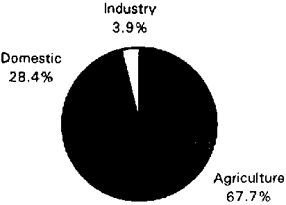 In 1994, water withdrawal for agricultural, domestic and industrial purposes was estimated at 1 293 million m, of which almost 68% for agricultural purposes (Figure 1). The assessment of agricultural water use is based on a water use of 11 200 m³/ha per year from surface water and 8 575 m³/ha per year from groundwater. In 1991, about 700 million m³ was estimated to be used for hydropower, with direct restitution to the natural river courses.