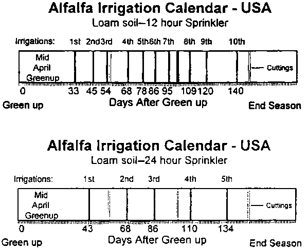 Utah, the United States. Irrigation scheduling calendars were generated for locations in Utah by Hill (1994). These calendars were nearly identical to those created for Pakistan, except that the schedules were not tied to a fixed rotation schedule, but were varied according to rates of soil water depletion. Examples of irrigation calendars for irrigated alfalfa in central Utah are shown in Figure 2, where the first schedule is for sprinkler irrigations lasting 12 hours and the second schedule is for sprinkler irrigations lasting 24 hours. Computations assumed 70% irrigation efficiency and 7.7 mm h-1 sprinkler application rates. The longer irrigation sets correlated with longer time periods between irrigations.