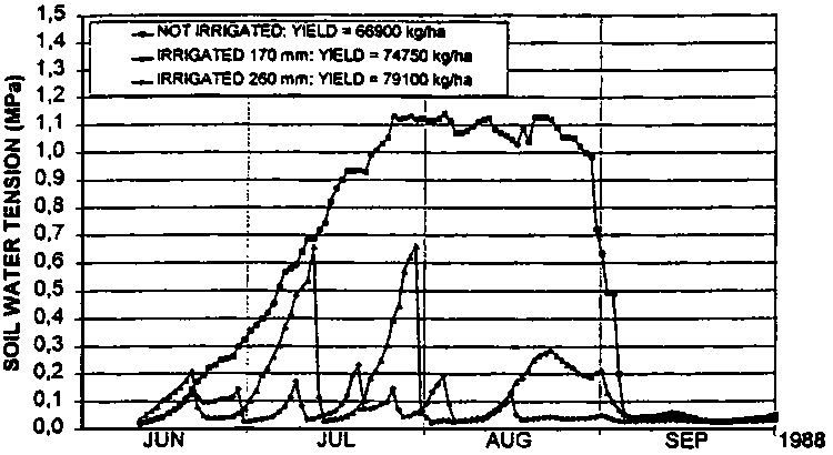 These experiments showed that the soil water tension within a depth of 20-40 cm below soil surface should be allowed to rise up to 0.50-0.60 MPa (Figure 2) in order to save water while maintaining a high level of crop yield.