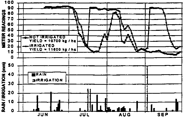 In practical irrigation scheduling, gypsum block readings at this depth should fall to 5-10 points (depending on the block type, see Figure 1) before irrigation is started. Following this instruction, irrigation may not be necessary to achieve economic yields on deep soils with high water storage and frequent rains. This is shown in Figure 3 where the readings of the gypsum blocks at 30 cm depth of an irrigated and a non-irrigated experimental field are compared.