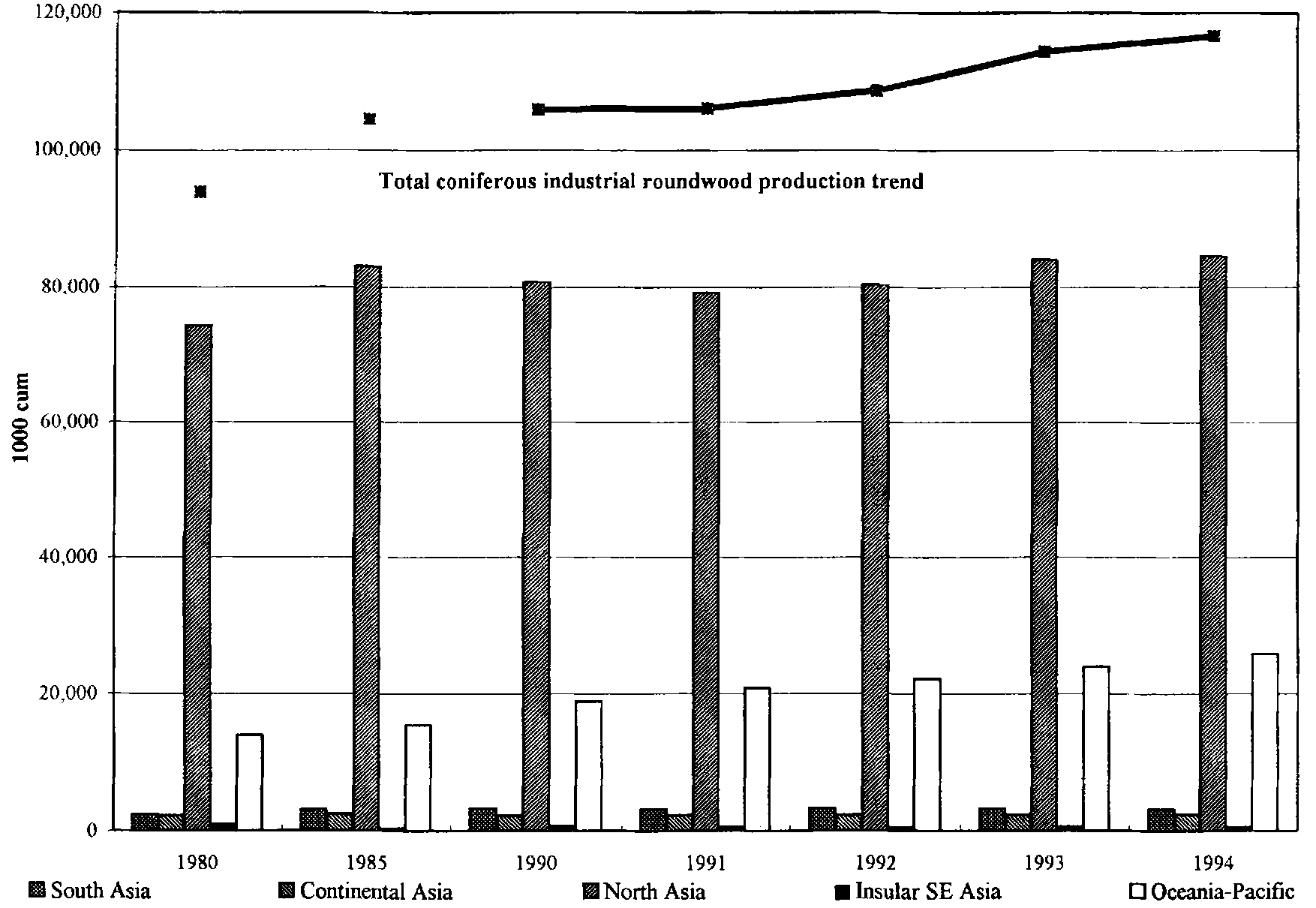 Comparable summary information for the sub-regions of the Asia Pacific Region for conifer industrial roundwood production is included in Figure 5 and Table 14, with sub-region and country detail included in Appendix 10. Total Asia Pacific Regional production increased from 93.9 million cubic meters in 1980 to 116.6 million cubic meters in 1994 with rather steady year to year increases from 1990-94. North Asia production increased by over 10 million cubic meters, from 74.2 million cubic meters to 84.6 million cubic meters. Gains of almost 14 million cubic meters in China were offset by a decline of 2.7 million decline in Japan and almost 750 thousand cubic meters in Mongolia. Oceania-S. Pacific production also increased sharply, from 13.9 million cubic meters in 1980 to almost 25.8 million cubic meters in 1994. Australia more than doubled output from 4 million to 8.9 million cubic meters, while New Zealand production grew from 9.7 million to over 16.7 million cubic meters. Other regional production changes were modest, with Papua New Guinea output falling by almost half to 64 thousand cubic meters and Fiji production tripling from 34 to 114 thousand cubic meters.