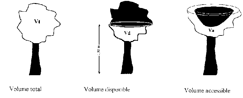 Seule une partie de cette biomasse totale évaluée sur le terrain est consommée par les animaux. C'est la partie accessible avec comme critère d'évaluation la hauteur et la pénétrabilité Ickowicz (1995) les réunit sous le terme de volume utile. Pour cet auteur, un ligneux fourrager est caractérisé par le volume de sa partie accessible (pénétrabilité), c'est-à-dire la périphérie du houppier inférieure à 1,5 m. C'est donc ce volume qu'il faut prendre en compte (figure m° 11).