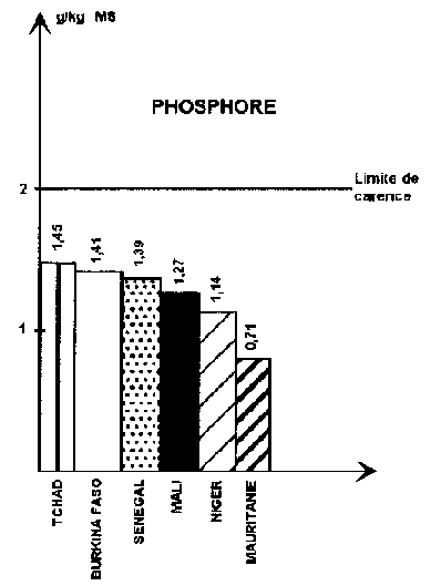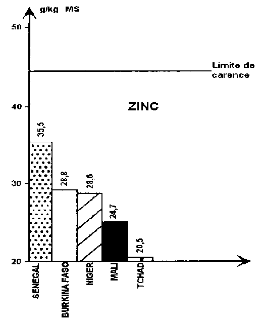 Les résultats de l'analyse fourragère renseignent donc sur la valeur du pâturage Ils informent, selon la période de l'année, sur les éventuels déficits de matières azotées et de valeur énergétique Des analyses plus fines donnent les valeurs des oligo-éléments et font apparaître des carences (figure n° 12) locales ou générales (Guérin et al., 1994). En effet, le principal facteur limitant de la nutrition minérale du cheptel tropical est le phosphore. Les teneurs en phosphore des fourrages dépassent rarement 2 g/kg MS; les graminées annuelles des parcours sahéliens sont les plus pauvres. Les graminées vivaces peuvent produire en saison sèche, après le passage d'un feu ou le pâturage, des repousses contenant jusqu'à 3 g de P/kg MS, mais cette teneur diminue pendant la croissance des plantes (de 0,1 g/kg MS par semaine d'âge). La teneur en phosphore des régimes des ruminants est améliorée par la consommation de dicotylédones herbacées ou ligneuses, mais faiblement Les teneurs en cuivre sont supérieures ou égales à la limite de carence dans les fourrages verts herbacés ou ligneux, mais inférieures à celles-ci dans les pailles. Celles en zinc sont le plus souvent inférieures à la limite de carence, mais parfois supérieures pour quelques espèces ligneuses En conséquence, les teneurs en zinc des rations peuvent être acceptables à certaines périodes, alors que l'analyse de la strate herbacée fait suspecter des risques de carences Le faible niveau d'apport de ces deux éléments est une constante de l'Afrique intertropicale, mais le risque de carence est plus ou moins aigu suivant les pays et les régions, y compris à l'intérieur d'une zone climatique donnée