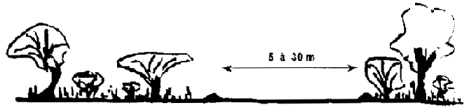 Dans le cas des feux précoces, la fertilité du sol est primordiale, Sur sols riches, le couvert se ferme par endroits: vraisemblablement au niveau des vieilles termitières7. Le feu ne passe plus régulièrement et le couvert continue de se fermer, Des îlots de forêt dense apparaissent et grandissent pour finir par se rejoindre, Le nombre des espèces de forêt dense semi-décidue augmente, Celles-ci risquent cependant de disparaître à l'occasion d'un feu courant qui traverserait la jeune forêt lors d'une année anormalement sèche, Sur sols pauvres, l'évolution au cours des premières années est semblable à celle de la parcelle "feux tardifs": les jeunes sujets sont détruits par le feu, Il semble cependant que certains gaulis d'espèces de savane en réchappent (peut-être à l'occasion d'années très pluvieuses où le feu est de faible intensité), Il s'établit ainsi une sorte d'équilibre qui maintient stable le peuplement ligneux: il n'y a qu'une faible production de bois,