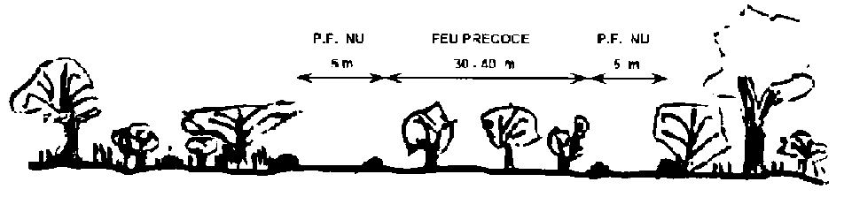 - le pare-feu sous végétation naturelle (brûlée annuellement par feu précoce): il double un pare-feu nu de cinq mètres sur une largeur de, trente à quarante mètres, où la végétation est brûlée précocement; ce type de pare-feu à l'avantage d'éviter les entretiens fréquents;