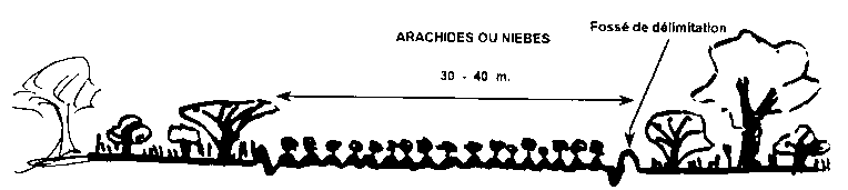 Le choix du type de pare-feu (figure n° 13) est fonction du sol, des moyens que l'on peut investir et des souhaits des populations. Les travaux d'établissements et d'entretien interfèrent avec la période de travail intense dans les champs d'ou une très faible disponibilité des villageois, ce qui constitue toujours la pierre d'achoppement en région tropicale sèche, si les moyens mécaniques sont exclus.
