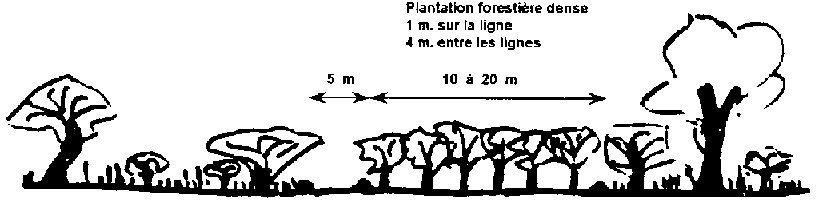 - le pare-feu arboré : le but est dé créer un couvert permanent et dense qui empêche l'herbe de poussier. Les espèces qui peuvent répondre à ces exigences en Afrique de l'Ouest sont entre autres, Anacardium occidentale Azadirachta indica, Khaya senegalensis, Ziziphus mauritania (feuillage souvent trop clair), Z. mucronata ou d'autres espèces à feuillage dense (Gmelina arborea, Mangifera indica). Il est recommandé de choisir des espèces à petites feuilles, car le tapis de feuilles tombées au sol, est moins combustible que celui formé par de grandes feuilles.
