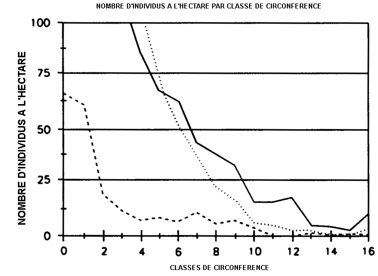 Figure n° 14: Parcelles de Kokondékro (Côte d'Ivoire). Nombre d'individus a l'hectare par classe de circonférence.