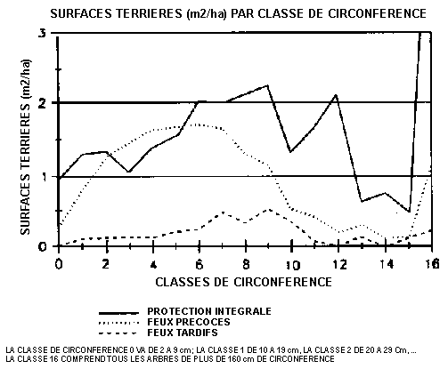 Les premières conclusions que l'on peut tirer de cet essai installé en zone soudano-guinéenne préforestière sont évidentes: l'application de différents traitements "feu", à une savane arborée assez homogène, crée, cinquante-huit années plus tard, des formations végétales extrêmement contrastées (figures 14 et 15), En l'absence de feux, sur deux sols de fertilité différente, une forêt dense humide semi-décidue se reconstitue, Rapidement, les feux tardifs détruisent les perchis et les rejets de souches ne peuvent pas se développer, Les souches meurent progressivement, Les arbres adultes des espèces dites "pyrorésistantes" tolèrent ces feux et continuent à se développer, mais leur régénération n'est plus assurée, Après une quarantaine d'années, les gros sujets dépérissent sans qu'ils soient remplacés par des baliveaux, Le couvert est de plus en plus lâche et les feux de plus en plus violents; la mortalité des arbres âgés augmente, Ils ne survivent difficilement que sur les sols les plus fertiles. Il est probable qu'ils disparaîtront bientôt laissant la place à une savane herbeuse,