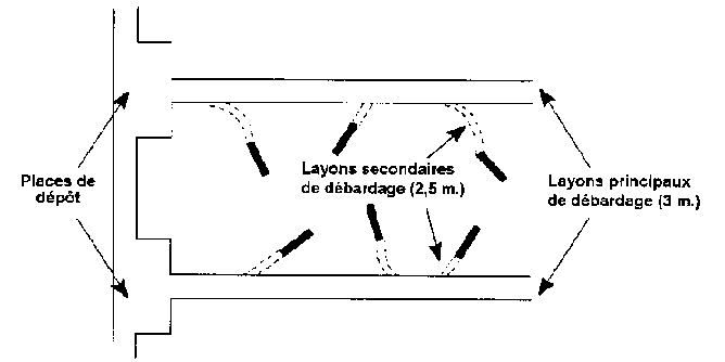 Figure n° 16.2: Infrastructure pour débardage attelé (Wyss, 1990). B. Infrastructure systématique avec ouverture de layons au niveau de chaque grume abattue