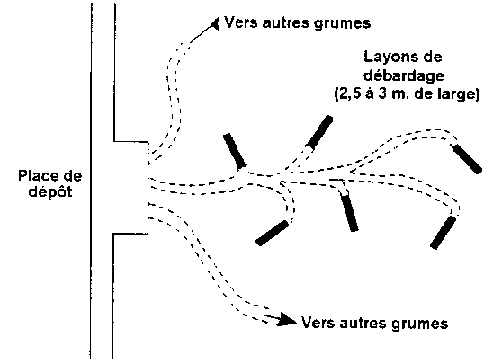 - une infrastructure non systématique, en fonction du bois abattu avec des layons d'axe à ouvrir pour chaque arbre. Un layon peut atteindre plusieurs arbres par zigzag. Les obstacles sont contournés et les layons sont moins longs, si le parcours entre les grumes est bien choisi. Ce dernier type de réseau est le plus adapté au débardage attelé.