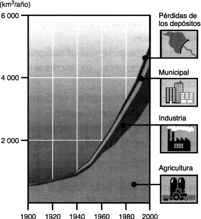 La agricultura es el mayor usuario de agua con un promedio mundial de 69%, seguida por la industria con 23% y el uso doméstico ciudadano con 8%. Pero la agricultura también es el sector que presenta el mas bajo retorno de la inversión y el mas alto nivel de malgasto y, en condiciones competitivas, disminuye su participación a nivel de las satisfacciones de la industria y de las ciudades. La Figura 2 muestra la evolución del uso del agua durante el siglo XX con estimaciones hasta el año 2000 y el dramático incremento que ha acompañado el crecimiento de la población y el desarrollo durante la segunda parte de ese siglo.