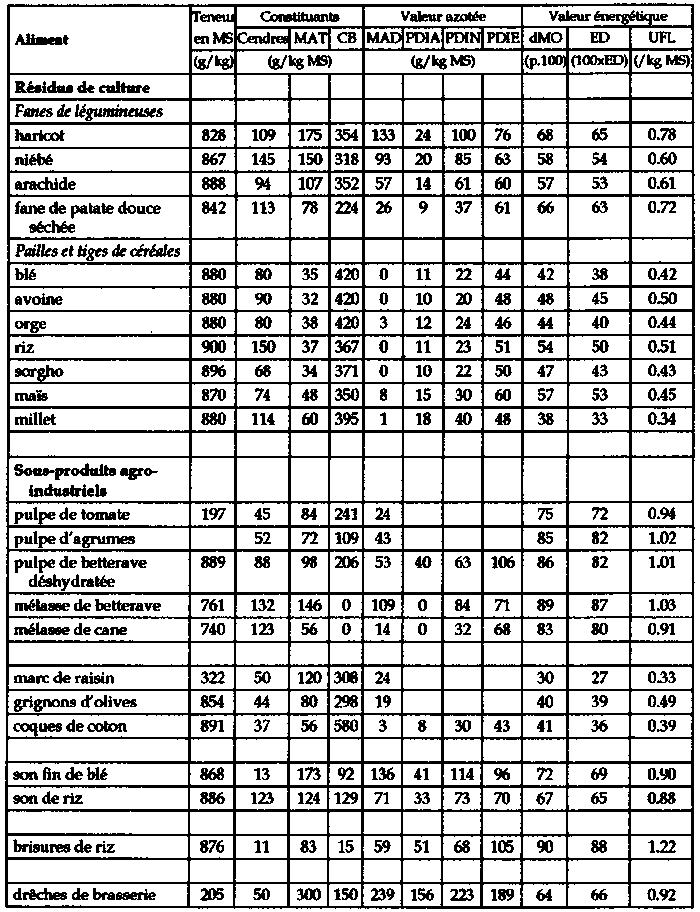 Annexe 6 - Valeur alimentaire moyenne des principaux résidus de culture et sous-produits agro-industriels (d'après INRA, 1988)
