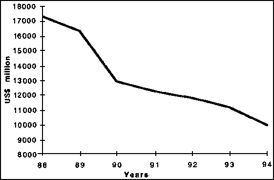 · The decreasing flow of development assistance.Most donor agencies are now faced with budgetary problems and changing priorities of their own which have led to a decline in aid to the agricultural sector and to agricultural cooperatives, as shown in the graph below: