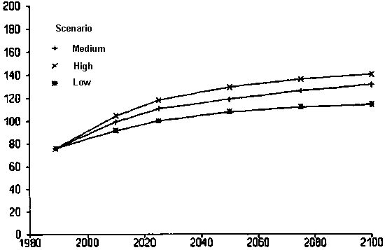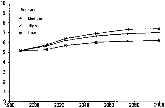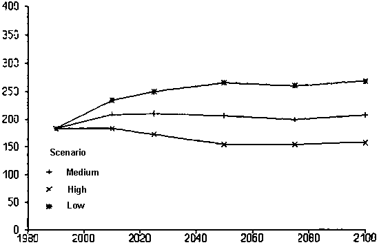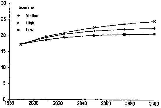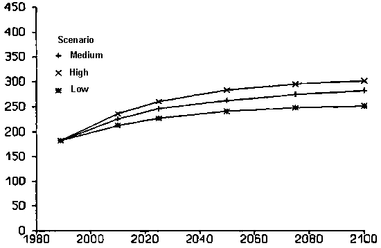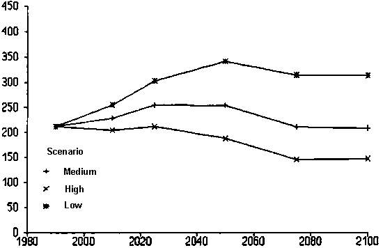 The arable land area is calculated from the harvested areas presented in Appendix 17 and discussed in Chapter 4, and the cropping intensities. For all developing countries, including China, the arable area increases at a rate of 0.3% per year from 836 in 1990 to close to 890 million ha in 2010 in the medium scenario (Table 16; Figure 5). In the years 2010-2025 the arable area increases by 0.2% per year to a maximum area of ~ 920 million ha in 2025, after which a slow decrease occurs close to the 1990 area. If China is excluded from the data, the area increases in the medium scenario at 0.3% per year from ~ 730 million ha at present to ~ 770 million ha in 2010. The arable area increases at an annual rate of 0.2% to a maximum of ~ 800 million ha in 2025, and then begins to decrease. The individual regions show similar results, with an increase in the first 40-50 years, and a stabilization or even a slow decline in the period after 2025 (Figure 5; Appendix 21). Due to the lack of available land in North Africa, the arable area remains constant.
