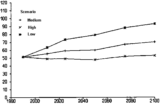 The cropping intensity for all developing countries, including China, increases from 87% at present to 94% in 2010 (Table 16). The maximum intensity in the medium scenario is 100%, which is the result of the relative increase of irrigated areas. If China is excluded from the data, the intensity is much lower, close to 80% at present and increasing to 85% in 2010, 88% in 2050 and 92% in 2100 in the medium scenario. The region with most intensive cropping is China and centrally planned Asian countries.