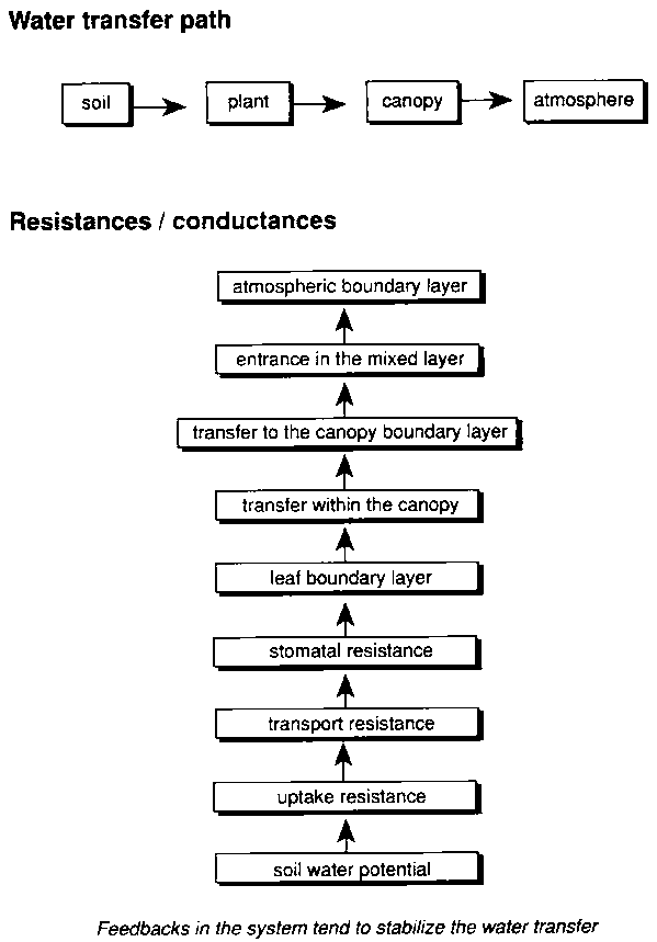 One of the more complex aspects of the estimation of changes in the water use of arable crops is the extrapolation from leaf and canopy to the field and region. This has long been recognized by the international scientific community, and has given rise to the establishment of several large-scale measuring campaigns (HAPEX: Hydrologic Atmospheric Pilot Experiment (Sahel and Spain), GEWEX: Global Energy and Water Cycle Experiment (World Climate Research Programme)) and to the start of the IGBP-BAHC programme (IGBP, 1993). A major part of the efforts will go into the development of the SVAT-models (Soil-Vegetation-Atmosphere-Transfer models). The extrapolation from the stomatal and leaf level to the region have been the subject of experimental and theoretical studies (McNaughton, 1994; McNaughton and Jarvis, 1991; Jacobs and de Bruin, 1992; Jacobs, 1994; Hollinger et al., 1994; Baldocchi, 1994a,b). In general the structure of the canopy determines to a large extent the transfer of heat and water vapour to the lower atmosphere. Most models to date neglect or oversimplify the feedback between the vegetated surface and the lower atmosphere, the planetary boundary layer (PBL). Jacobs (1994) showed in a study using coupled models (one-dimensional model for the PBL coupled to a modified Penman-Monteith big-leaf model) that in such a model the sensitivity of regional transpiration to changes in surface resistance is reduced (about halved) but that the sensitivity to changes in albedo is increased by between 25 and 250% relative to the values obtained without PBL feedback.