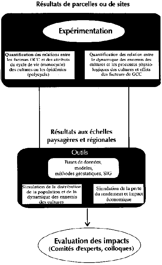 Un des effets perceptibles du changement global peut être les modifications chez les ennemis des cultures et les mauvaises herbes ('ennemis des cultures' comprennent ici les insectes nuisibles et les pathogènes microbiens). En effet, le changement global affectera potentiellement les relations hôtes-ennemis des cultures/mauvaises herbes de trois façons au moins: en affectant la population ennemis des cultures/mauvaises herbes; en affectant la population de l'hôte; et en affectant l'interaction hôte-ennemi des cultures/mauvaise herbe. On suppose que l'effet net se manifestera d'une de ces manières: (i) les ennemis des cultures/mauvaises herbes actuellement de moindre importance peuvent devenir prépondérants et causer de sérieuses pertes; (ii) la distribution et l'intensité des ennemis des cultures/mauvaises herbes peuvent être affectées, ce qui mènerait à modifier les effets sur le rendement et aussi sur les techniques de compensation comme les pesticides et la gestion intégrée des ennemis des cultures; et (iii) les capacités compétitives dans les interactions plantes-mauvaises herbes peuvent être affectées par des modifications écophysiologiques. Le but de cette Activité est donc de déterminer, à travers des réseaux mondiaux de recherche, de partage des données et de modélisation, l'impact potentiel du changement global sur la distribution et la dynamique des ennemis des cultures et des mauvaises herbes et, à partir de là, le coût socio-économique d'un tel impact. Un schéma conceptuel pour générer des résultats spécifiques (évaluation d'impact) est présenté à la Figure 12.3.