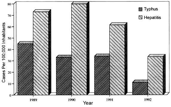 IMPACT OF CROP RESTRICTIONS ON DISEASE LEVELS NEAR SANTIAGO, CHILE For example, Figure 2 shows that almost 60% of the irrigated area within the Metropolitan Region of Chile (Santiago) uses water in excess of 10 000 faecal coliforms per 100 ml. In 1992, as a result of a cholera outbreak, the Government of Chile began a vigorous crop restriction programme in the areas with the worst contamination. Preliminary data show that, in addition to controlling the cholera outbreak, there has been a dramatic decline in the cases of hepatitis and typhus (Figure 3). FIGURE 3: Cases of hepatitis and typhus reported in Chile (Source: FAO, 1993) |