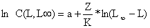 onde C(L,L∞) significa a captura acumulada dos peixes a partir do comprimento L. O declive estimado pela regressão linear da Eq. 4.4.6.1 representa Z/K, e portanto uma estimação de Z é obtida através de: