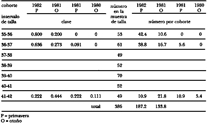 La Fig. 17.3.5.1C1 presenta una muestra de frecuencias de talla (tomada de Macdonald y Pitcher, 1979) de 523 lucios del Lago Heming, Canadá, agrupadas en intervalos de 2 cm de talla. Hay cinco cohortes, determinadas sobre la base de lecturas de edad sobre escamas con tallas medias según se muestra en la siguiente tabla: