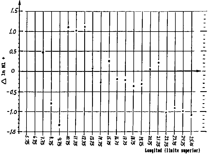 Fig. 17.3.5.1A Distribución de frecuencia de talla de un muestreo hipotético. La línea continua corresponde a promedios móviles de 5 valores vecinos.