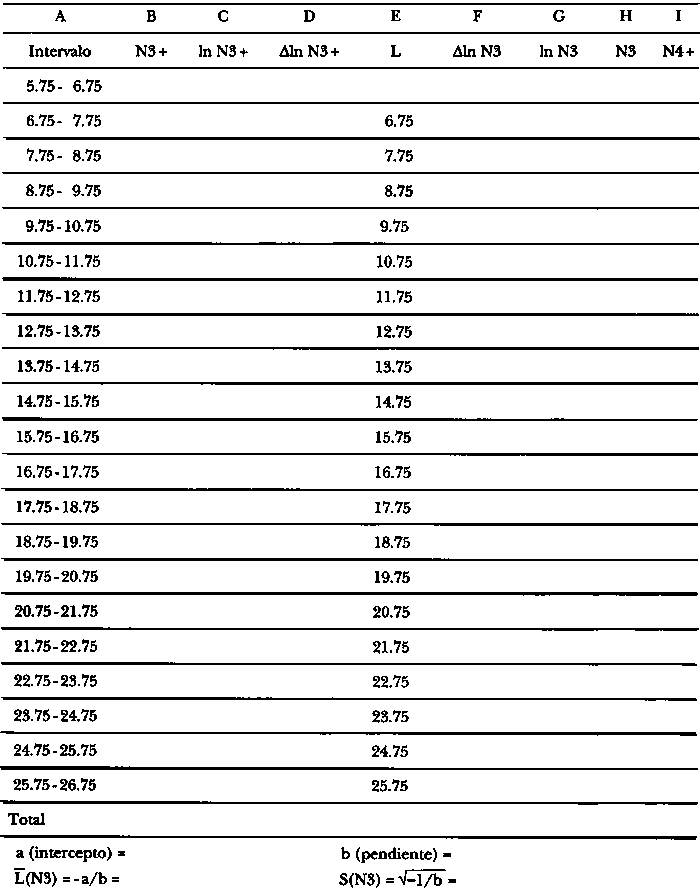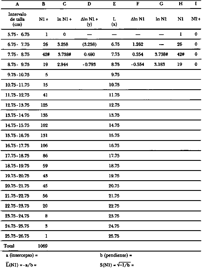 Estime cuántos de estos 386 peces pertenecían a cada una de las seis cohortes listadas en la Tabla 3.2.1.1, completando la hoja de trabajo.