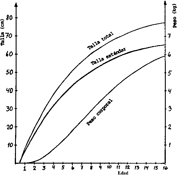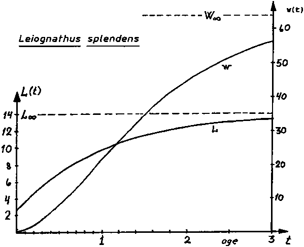 Fig. 18.3.1 Curvas de crecimiento basado en las ecuaciones de crecimiento de von Bertalanffy (ver hoja de trabajo 3.1).