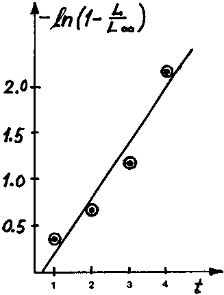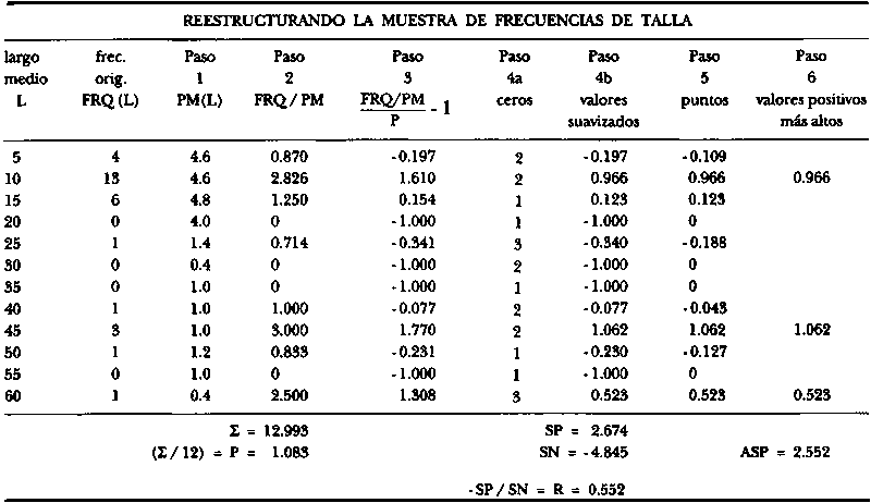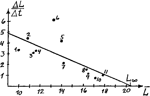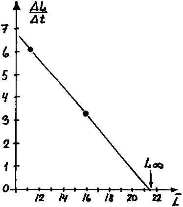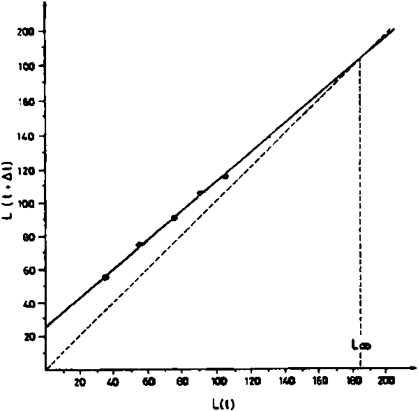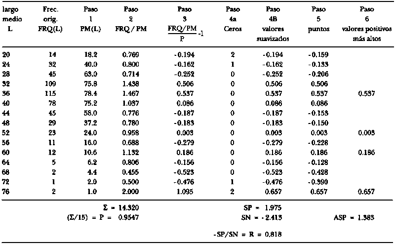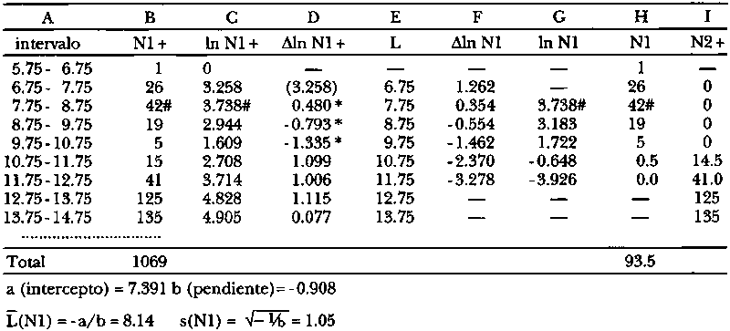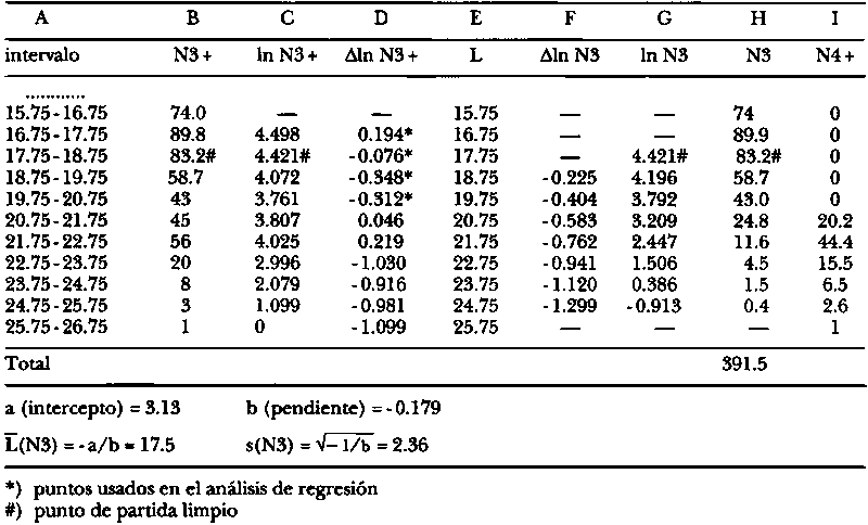 Fig. 18.3.4.1B Gráfico de Gulland y Holt en el que se utilizan las longitudes medias de las cohortes obtenidas al utilizar el método de Battacharya (ver hojas de trabajo 3.4.1a, b, c y figura 18.3.4.1A).