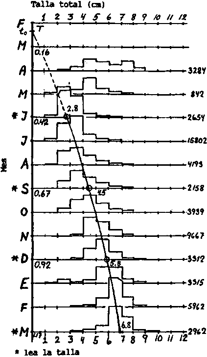 Fig. 18.3.4.2A Progresión de las modas en las distribuciones de frecuencias de talla mensuales del motambo esplendor (ver hoja de trabajo 3.4.2).