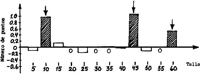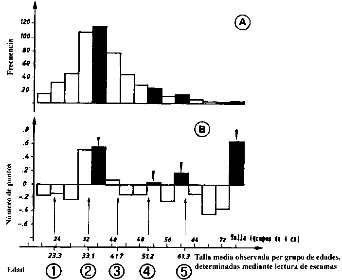 Fig. 18.3.4.2B Progresión de las modas en las distribuciones de frecuencias de talla de la caballa de la India (ver hoja de trabajo 3.4.2).
