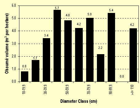 Les dommages subis par les okoumés sont considérés séparément, puisque l'okoumé représente en ce moment l'espèce commerciale la plus importante. Pendant le débardage, 19 okoumés, distribués sur 59,5 ha, étaient endommagés. De ces okoumés, huit avaient un dbh inférieur à 40 cm, huit avaient un dbh de 40 à 80 cm, et trois avaient plus de 80 cm. L'étude d'abattage a révélé qu'un total de 20 okoumés étaient endommagés sur 30 sites d'abattage. De ces okoumés, neuf avaient un dbh inférieur à 40 cm, neuf étaient dans la classe de dbh de 40-80 cm et deux avaient plus de 80 cm.