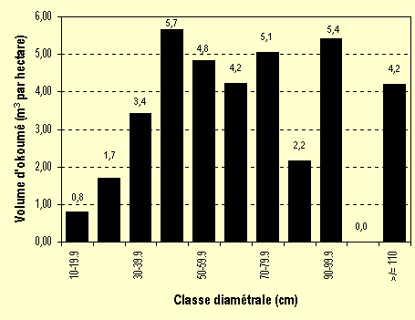 Le Tableau 6-3 montre les résultats par classe de diamètre pour la zone étudiée. La superficie totale des dix bandes inventoriées était de 17,7 ha, le nombre total d'arbres inventoriés était de 8 062. La densité moyenne de tous les arbres ayant un diamètre supérieur ou égal à 10 cm était de 455 par hectare, soit 15,3% dont 3,3% sont des okoumés. La superficie à la base pour tous les arbres 10+ cm était de 28,6 m² par hectare ; pour l'okoumé, elle était de 2,7 m². L'inventaire a fait ressortir 46,9 arbres par hectare dont le dbh est entre 40 et 80 cm à hauteur de poitrine, dont 5,1/ha sont des okoumés (10,8%). Le nombre total d'arbres dont le dbh est supérieur à 80 cm était de 3,9 par hectare, dont 1,2 arbre/ha sont des okoumés (30,1%). La proportion de l'okoumé augmente considérablement dans les classes de diamètre au-dessus de 50 cm.