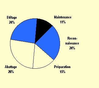 Pour évaluer la superficie totale perturbée dans VMA95, les superficies couvertes par les routes, les pistes de débardage, les sites d'abattage et les parcs de chargement étaient prises ensemble. Le Tableau 6-18 montre qu'environ 8-4% soit 1 306 ha de toute la superficie de la forêt (15 550 ha) était perturbée par ces facteurs. Les services tels que les camps d'ouvriers, les ateliers et l'aéroport privé ne sont pas pris en considération dans cette estimation. Ces services sont utilisés pour l'exploitation de plusieurs coupes annuelles. Leur contribution à l'utillisation de la superficie était donc relativement faible.