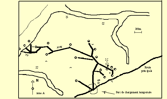 Les résumés suivants comparent les résultats d'abattage et de débardage. Le Tableau 6-16 présente les tableaux d'évaluation des dommages dus à l'abattage et au débardage. Les résultats sont dérivés d'une zone d'échantillonnage relativement petite de 58 hectares qui se trouve dans les zones A, B et C, alors que la zone totale d'exploitation en 1995 était d'environ 15 550 ha. Toutefois le volume moyen débardé dans les zones A, B et C était de 5,8 m³/ha après tronçonnage; ce qui représente le volume moyen par hectare exploité par l'entreprise pendant les 30 dernières années.