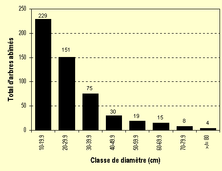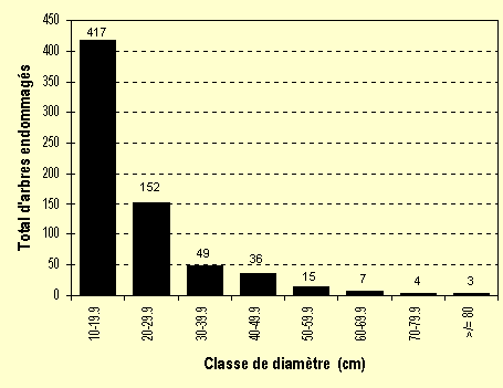 La somme des arbres déracinés/cassés ou avec la couronne et l'écorce endommagées est présentée comme légèrement supérieure à 100% dans le Tableau 6-14. Ceci s'explique par le fait que quelques fois les arbres étaient comptés deux fois puisqu'ils étaient endommagés à la fois à la couronne et à l'écorce. Cependant, les arbres déracinés ou cassés n'ont été comptés qu'une seule fois. Ces arbres déracinés ou cassés sont considérés comme non productifs et ne présentent aucune valeur commerciale à l'avenir.