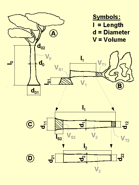 Figure 5-4 illustrates the stem and log volumes used for calculating wood recoveries on different harvesting levels. Detail A shows the standing tree, B the tree after felling, C the log after removing the crown (topping) and D the log after removing the remaining buttresses and crosscutting the top end.