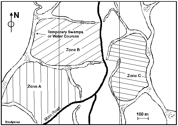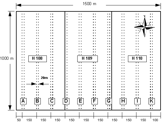 The study was carried out in annual coupe VMA95, which consists of 15,550 ha of broad-leaved forest. This forest is part of a 150,000 ha concession of the forest industry enterprise SOCOBOIS. Out of annual coupe VMA95, a 150 ha study area was selected. The study area consists of three adjacent harvest compartments H108, H109, and H110 (Figure 5-1 Layout). These compartments are located close to the main haul road.