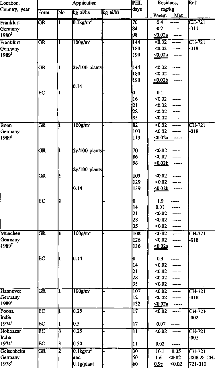 Residue trials were reported from Germany, India, the USA and the UK. There were three German trials according to each of three different German GAP treatments: 2 g/100 plants nursery granular, the 0.1 g/plant single bed treatment and the 2 kg ai/ha granular "spreading" application. The UK and Dutch spray treatment (ca. 4-5 kg ai/ha) at the time of drilling or transplanting was reflected by four German trials. All the residues in these trials were <0.02 mg/kg.