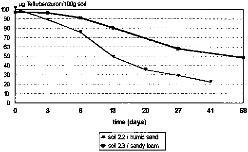 Degradation. The degradation of unlabelled teflubenzuron in two different types of soil was studied by Heupt (1984). Analytical grade teflubenzuron was added at a starting concentration of 100 mg per 100 g soil (1 mg/kg).