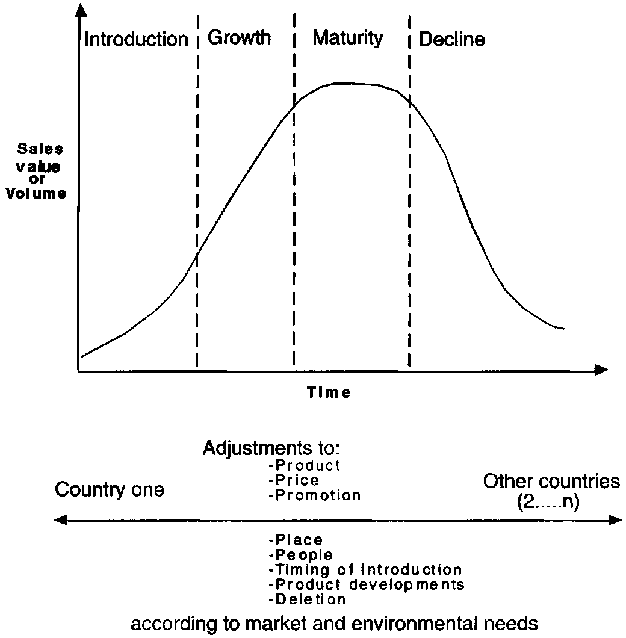 The traditional four stage life cycle - introduction, growth, maturity, decline - is a well documented phenomenon. Attempts are made in the maturity stage to extend the cycle. The market life cycle is very similar and what global marketers have to be wary of is that not all markets are at the same stage globally. It may be appropriate to have tractor mounted ditchers and diggers in Africa or the UK where labour is not too plentiful, but in India, they may be the last thing required where labour is plentiful and very cheap. So the appropriate marketing strategy will be different for each market.