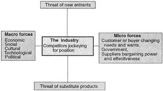 One way to look at competition is by industry analysis. Competition drives down rates of return on invested capital. If the rate is "competitive" it will encourage investment, if not, it will discourage competition. Porter1 (1980) and (1985) looked at the forces influencing competition in an industry and the elements of industry structure. Figure 6.1 shows the four forces influencing competition, threat of new entrants, threat of substitute products, "macro" factors like changes in technology and social factors and "micro" factors like customers' or buyers' changing needs.