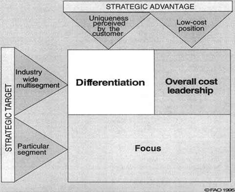 If there are few perceived differences between products and their uses are widespread, then the lowest cost firms will get the advantage. This is the case of television sets and many fruit products. If there is a large perceived difference created, then the firm has more price leeway. CARMEL and OUTSPAN successfully created a perceived quality advantage, as have Cadbury and Nestle. Focus strategies concentrate on serving a particular segment better than anyone else. A good example of this is the Dutch flower auction or Gerber baby foods.